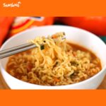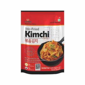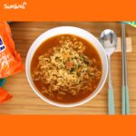 It has a spicy taste. The noodles are soft and chewy. Korean chili onion